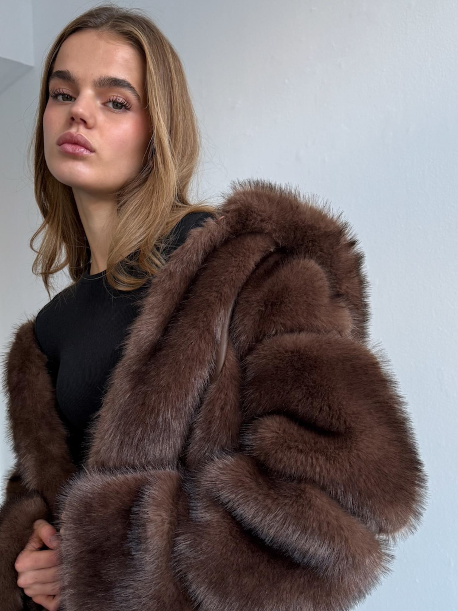 • A model wearing a luxurious brown faux fur coat with a hood, styled with sleek black sunglasses, showcasing MEOTINE's elegance.