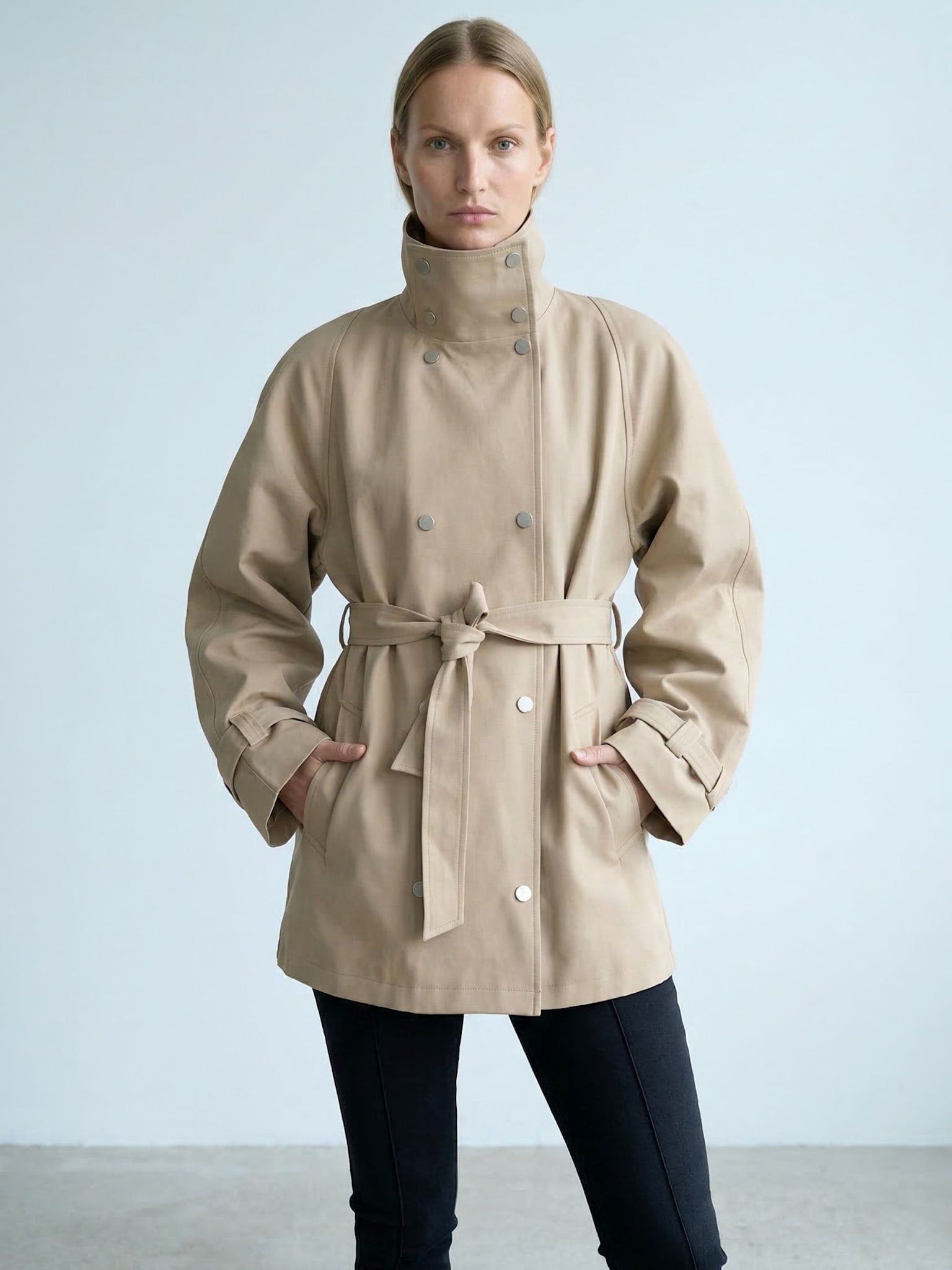 A Modern take on the classic trenchjacket is crafted for a clean, contemporary look with a high collar and button-down front. It features two practical pockets and a waist-defining belt, allowing you to cinch for a tailored silhouette or wear loose for effortless fit.