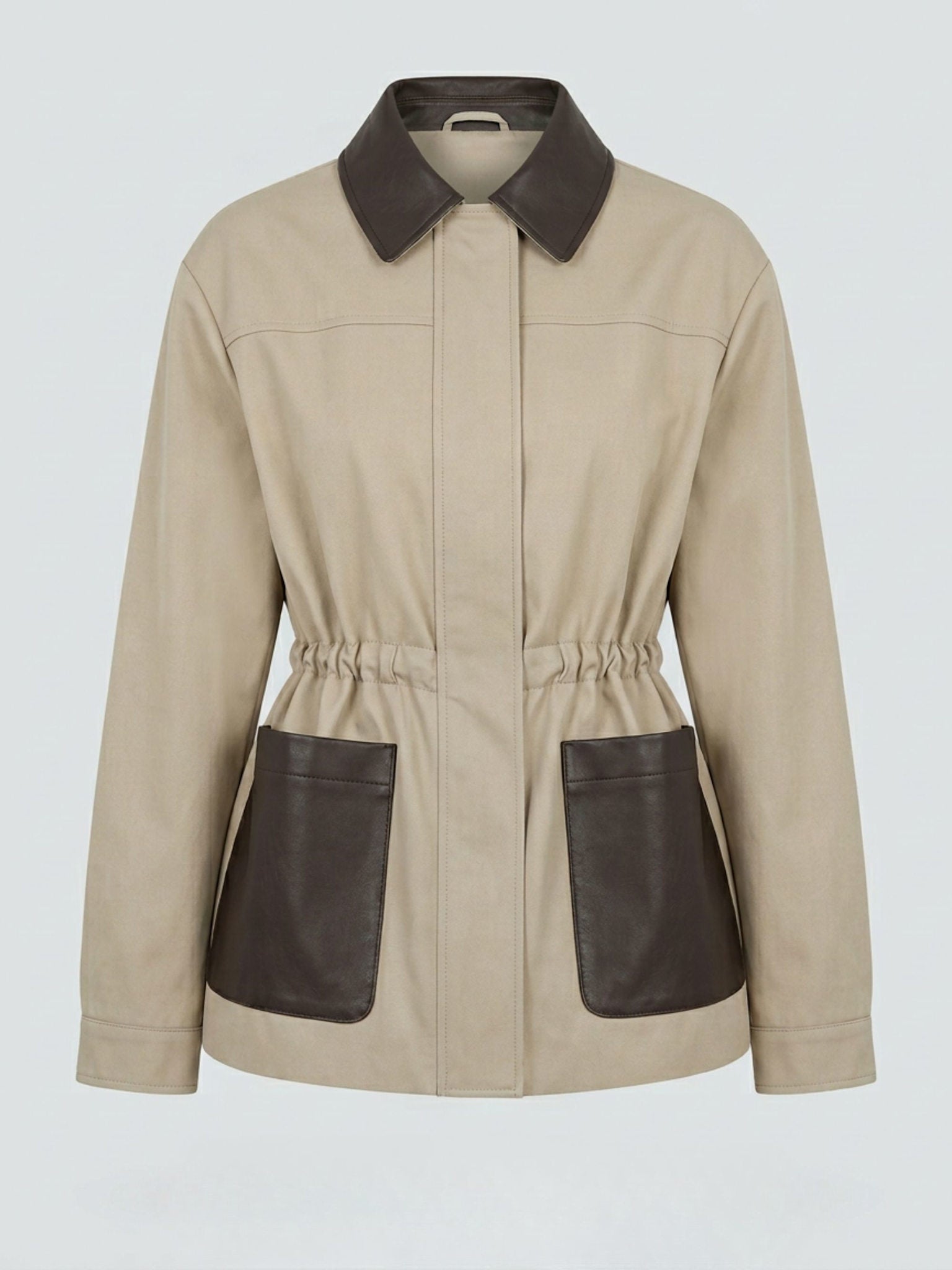 The Maris Jacket is crafted from structured cotton with a durable, sleek finish. Designed in a regular silhouette, it features a front closure with a concealed zipper and hidden snap buttons, complemented by a contrasting leather collar for a refined touch. Large leather patch pockets and an elasticated waist create a balance between utility and femininity. A modern transitional piece with effortless sophistication.