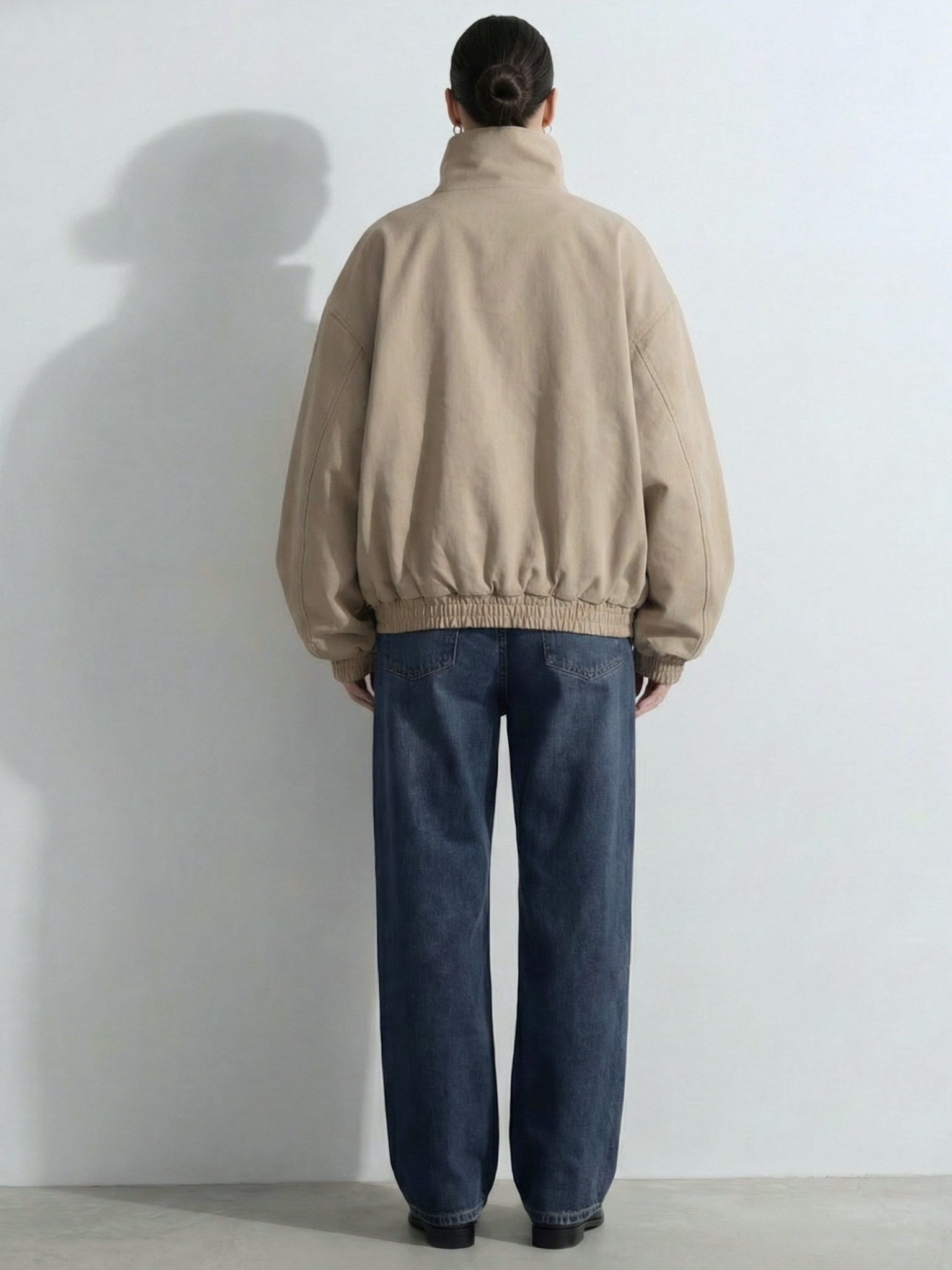 The Ezren Bomber Jacket is made from soft, structured cotton with a matte finish. Designed in an oversized silhouette with exaggerated volume in both the body and sleeves, it features a high stand collar and a snap button closure at the front. The interior lining at the collar and front features subtle stripes, adding a refined, shirt-inspired detail. An elasticated hem enhances the shape, creating effortless yet balanced proportions.
