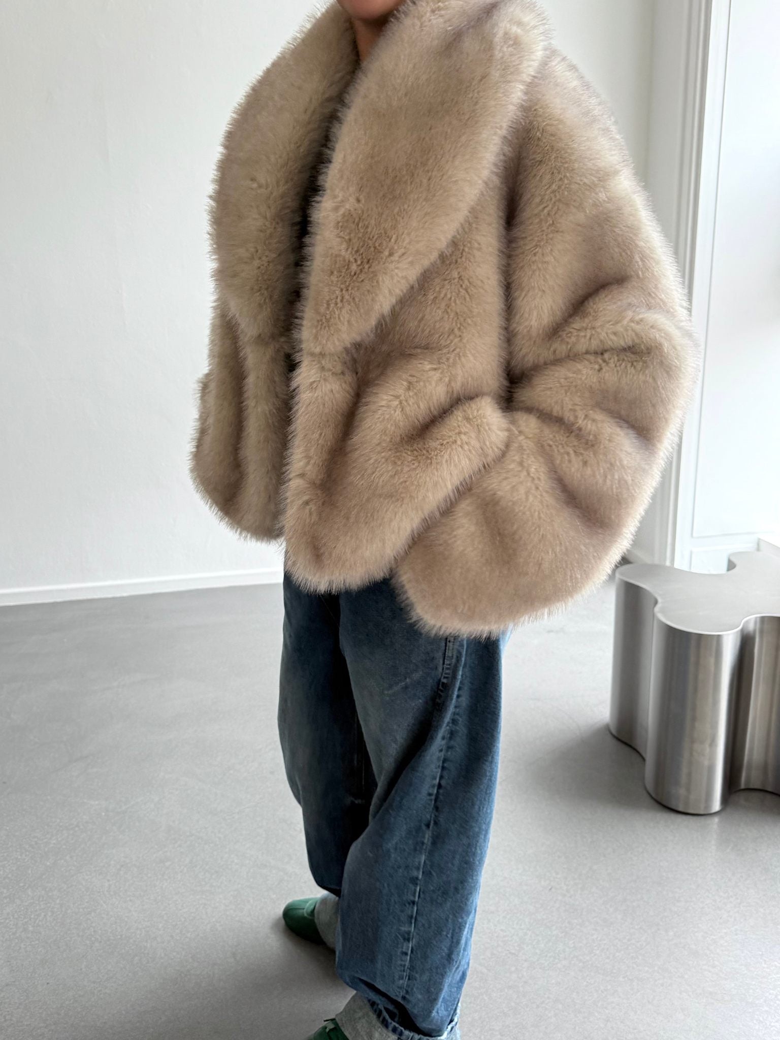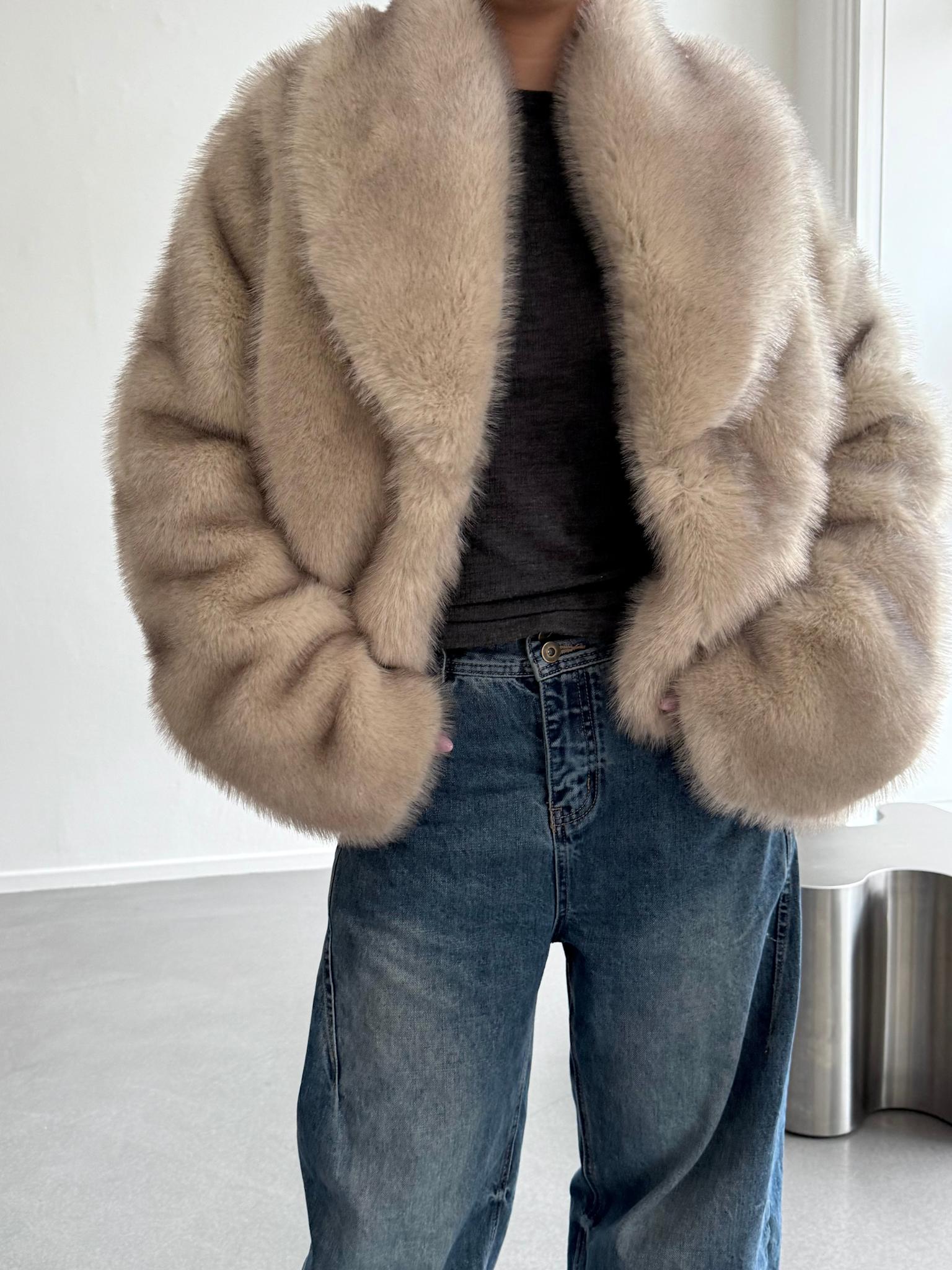 The Katha Faux Fur Jacket is crafted for an oversized silhouette in plush faux fur with a soft hand feel. Designed with a wide lapel collar and seamless hidden closure, wide sleeves complete the design, adding subtle volume. Size down for a closer fit.