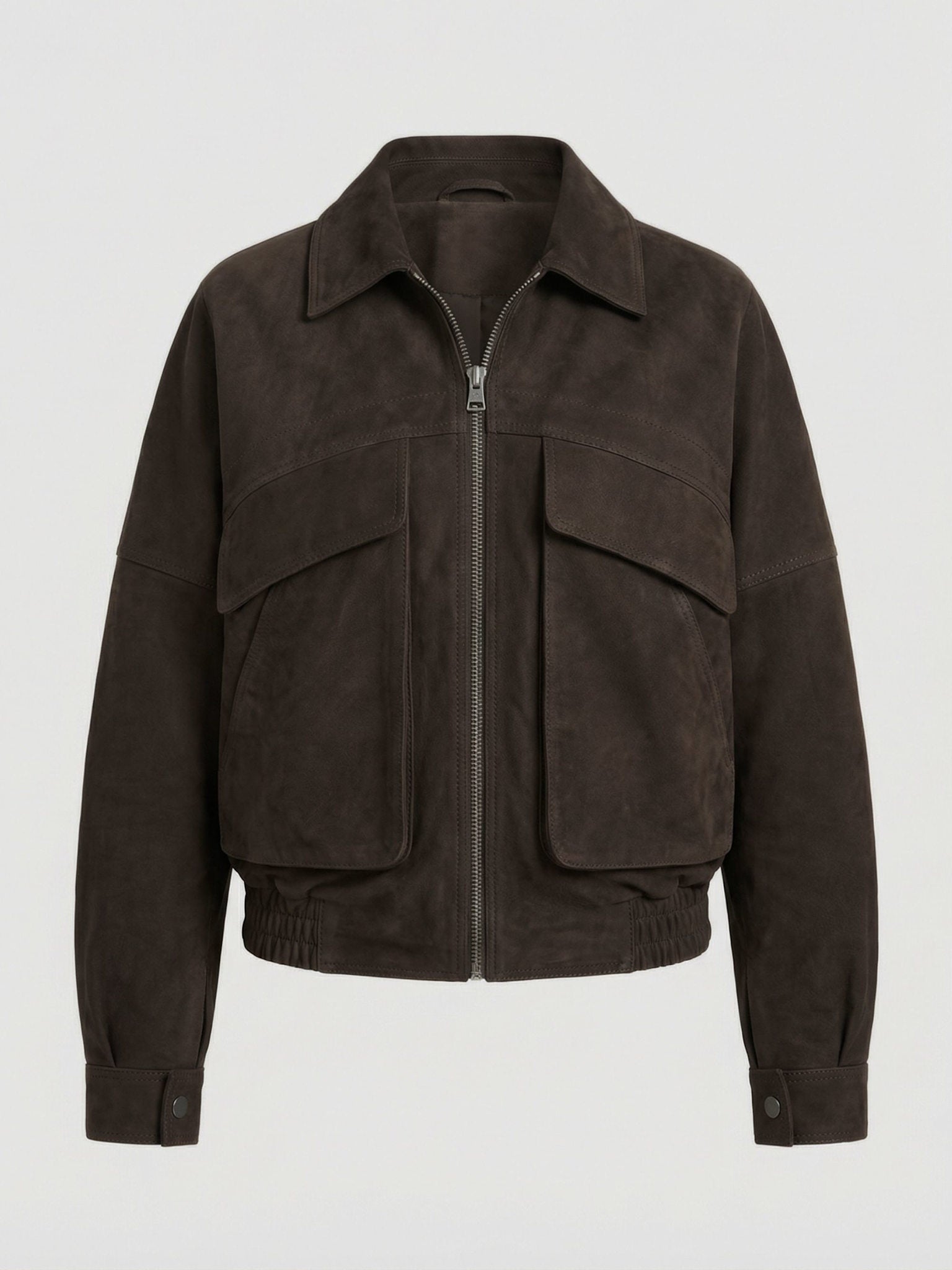 The Esme Jacket is crafted from soft nubuck leather with a rich, vintage-inspired brown finish. Designed in a relaxed silhouette, it features a neat point collar, oversized flap chest pockets and a front zip closure. An elasticated hem adds subtle shape, while snap-button cuffs complete the clean, utility-driven look. A modern essential with understated edge.