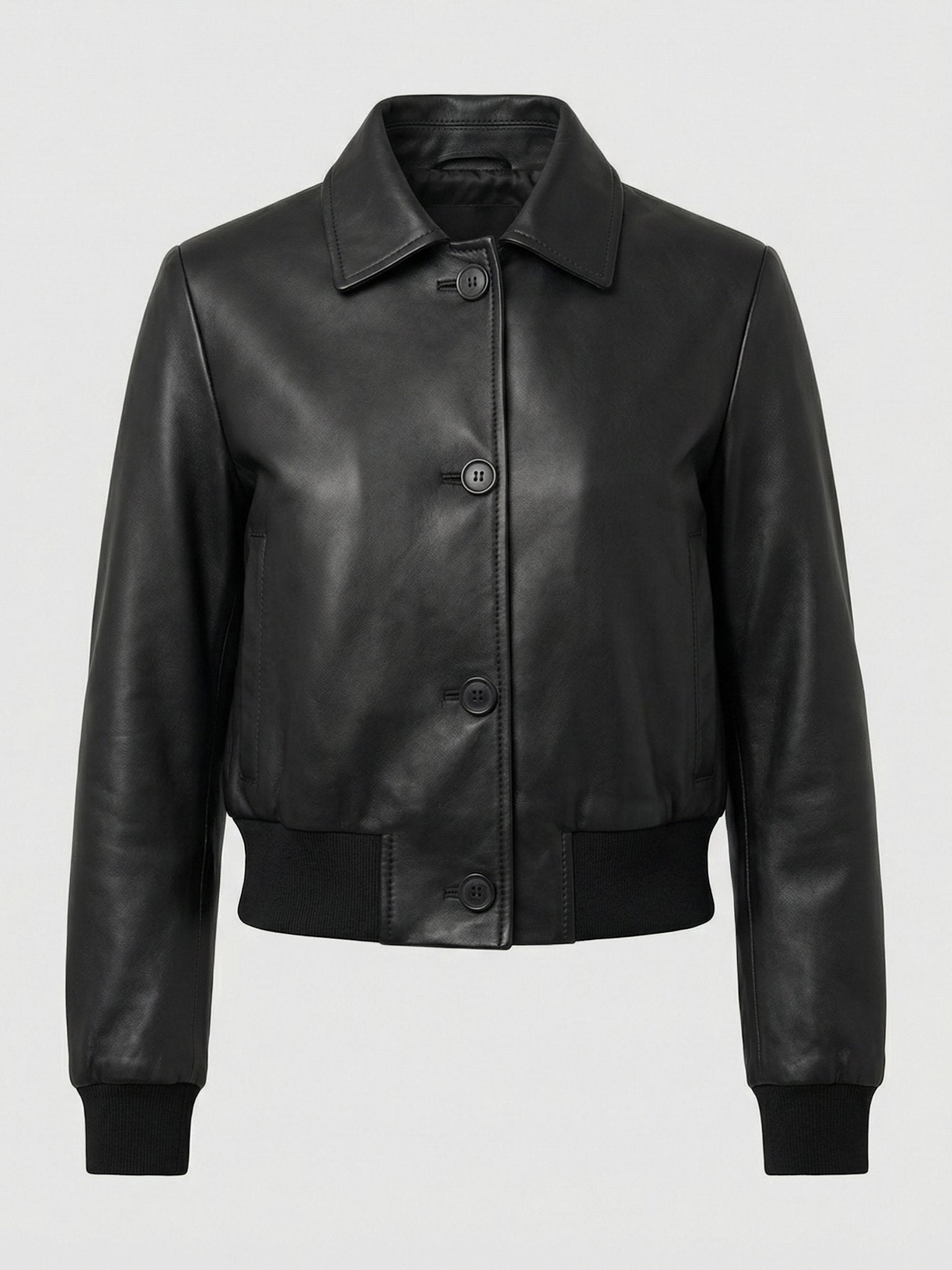 The Skye Jacket is crafted from smooth leather with a clean, refined finish. Designed in a cropped silhouette, it features a classic shirt collar and a front button closure. Ribbed cuffs and hem add structure and a modern bomber-inspired touch, while discreet side pockets maintain a minimal and elegant aesthetic. A timeless leather essential with everyday versatility.