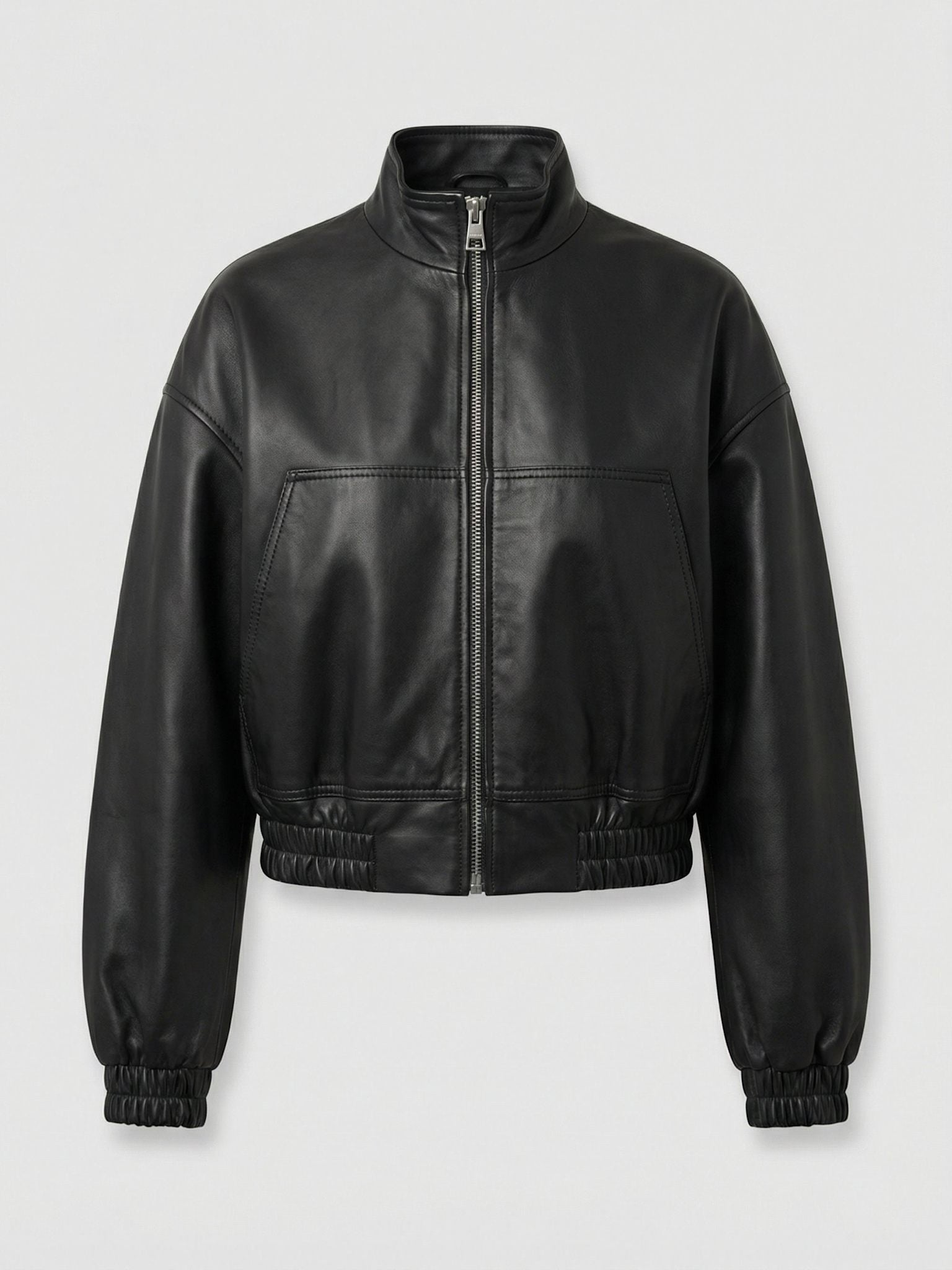 The Raven Jacket is crafted from supple leather with a soft finish. The bomber, designed in a slightly cropped, relaxed silhouette, features a high collar and a front zip closure. A wide front patch pocket adds a subtle detail, while elasticated cuffs and hem create soft volume and shape.