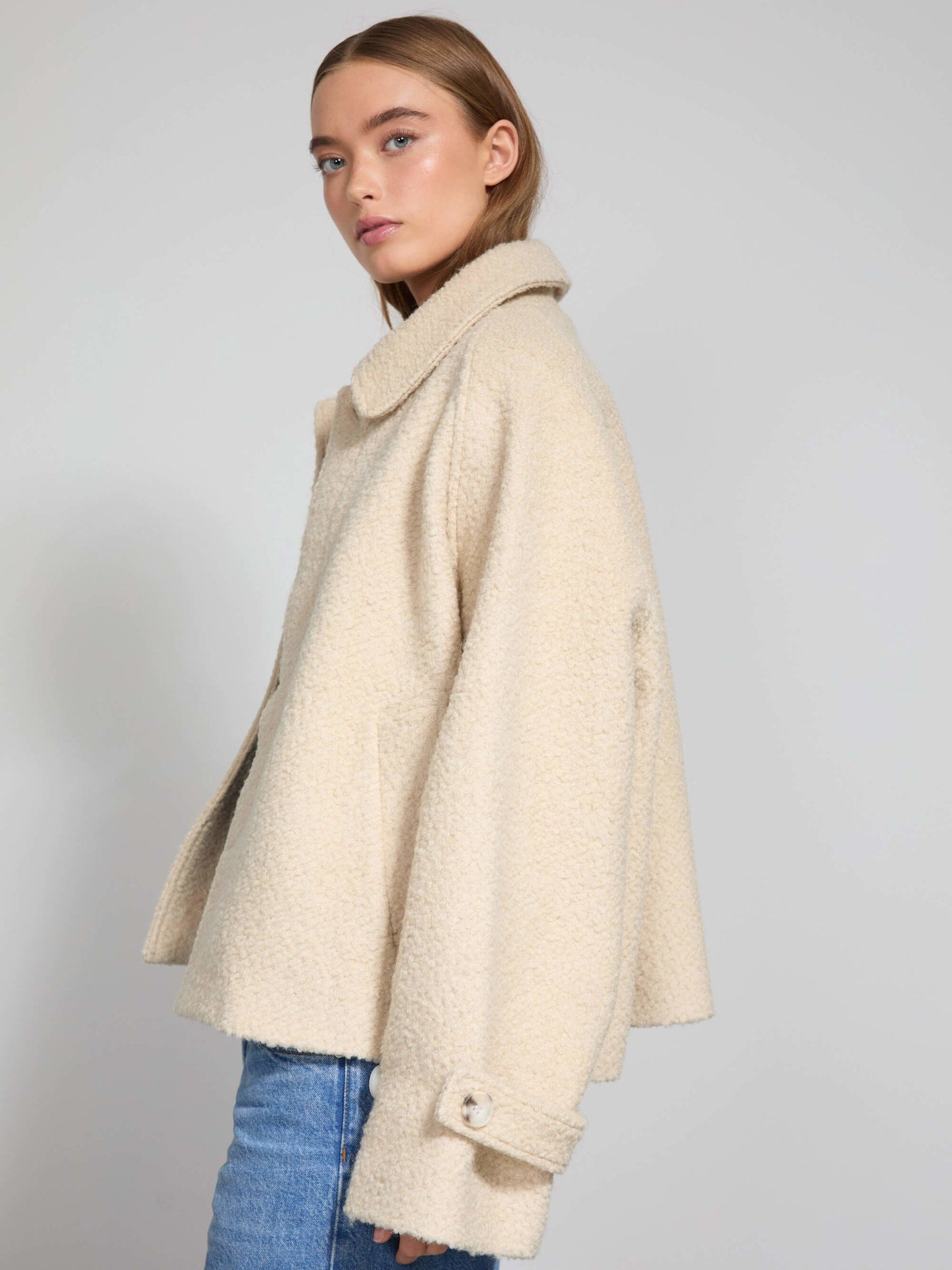 Designed in a textured wool-polyester blend, this jacket showcases a beautiful bouclé weave that adds depth and a refined edge to any look. The A-line silhouette gives a subtle flare from the shoulders down, creating an elegant drape that moves with you.