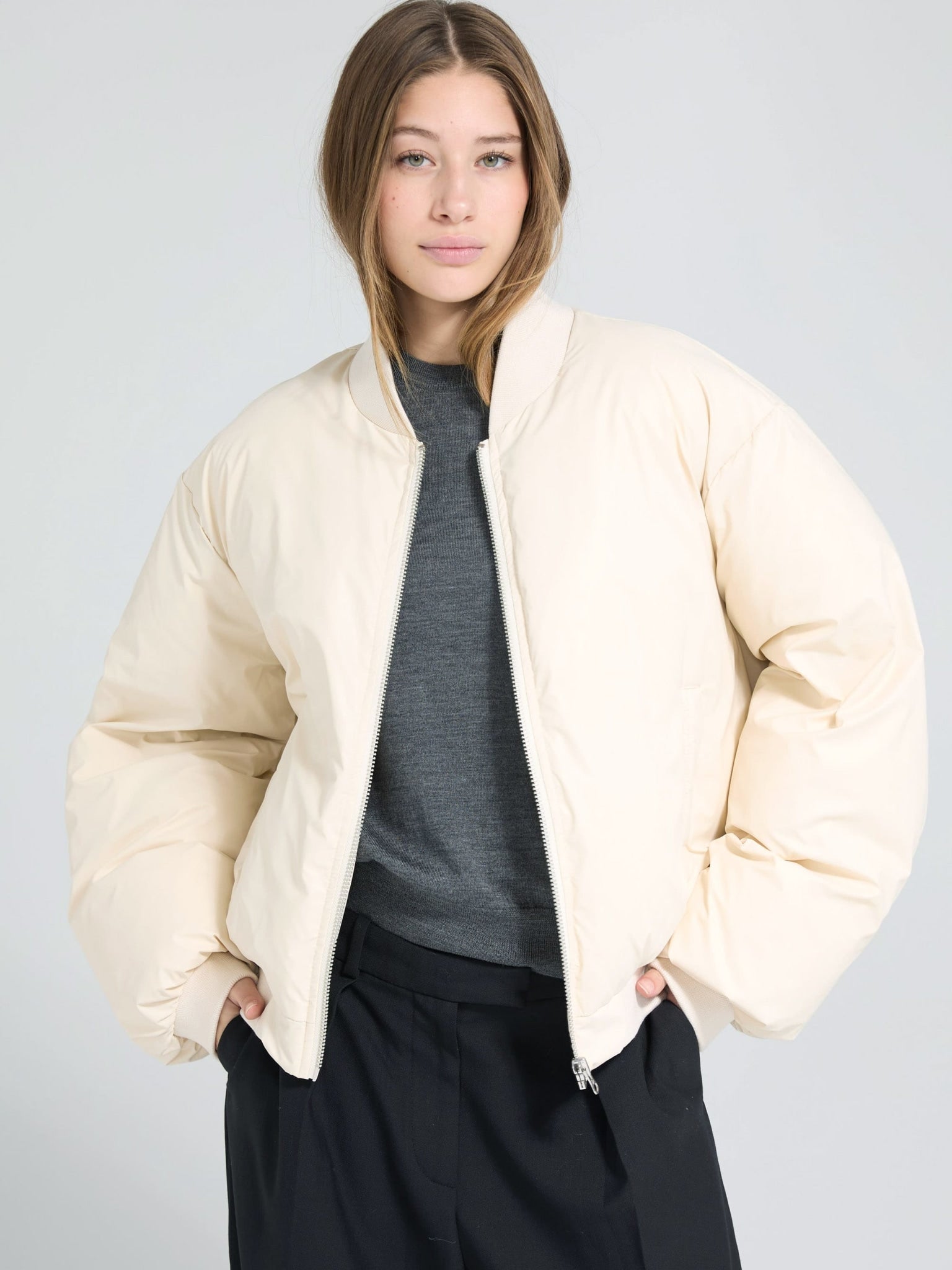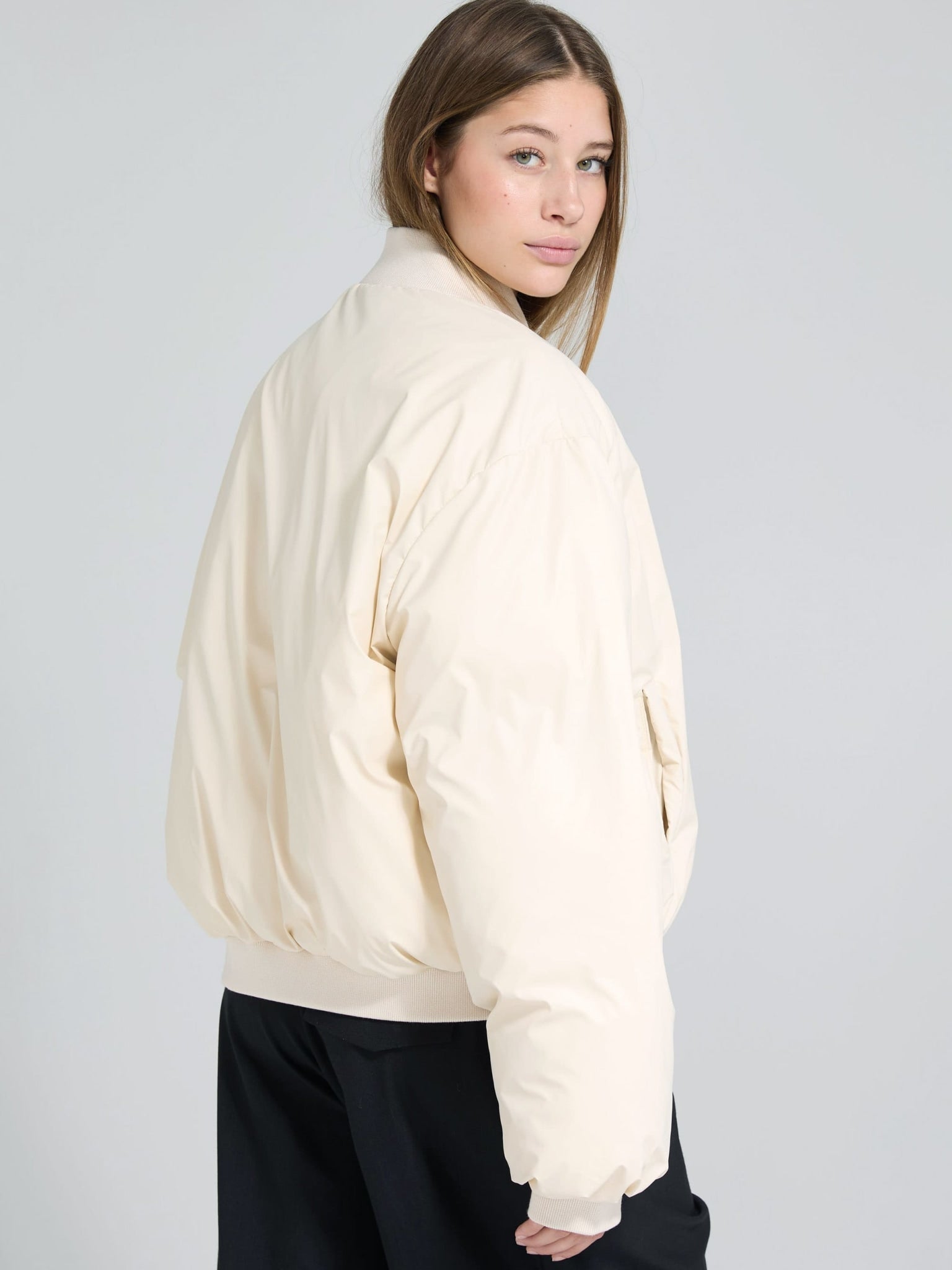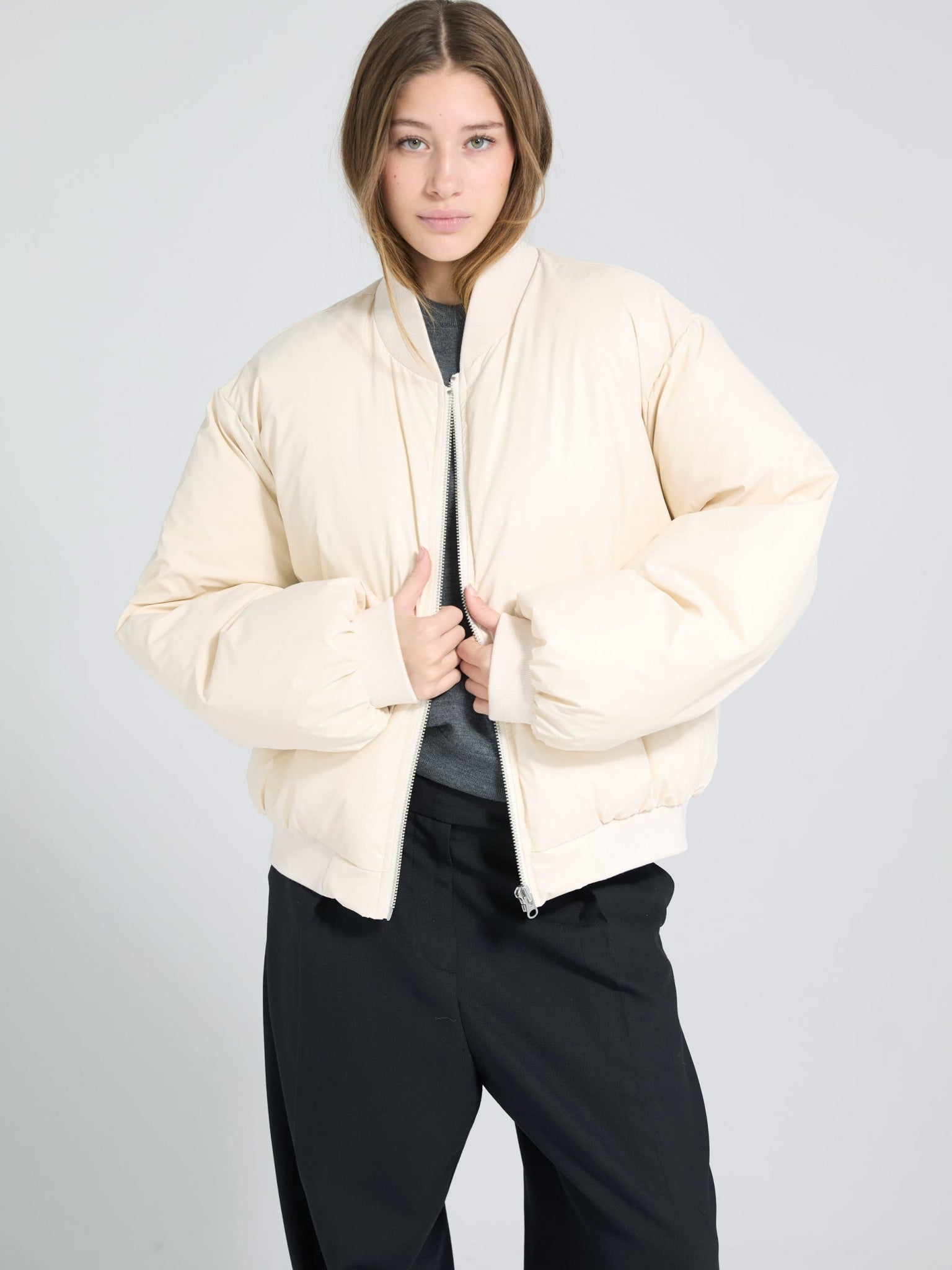 The Sol Bomber Jacket is a cool oversized bomber jacket. It is cut for an oversized fit, that provides comfort and style. It's detailed with two front pockets and a metal zipper in front.