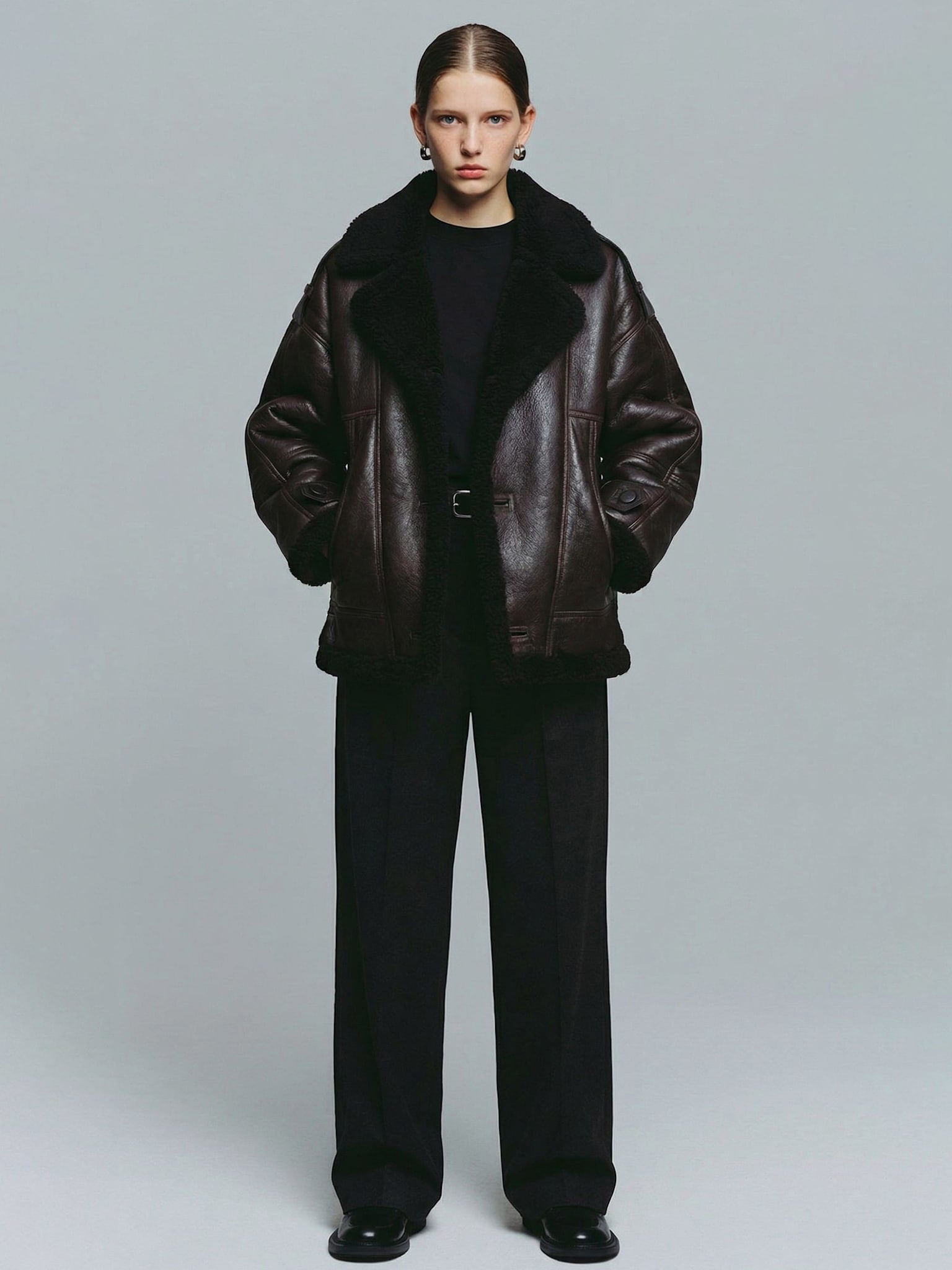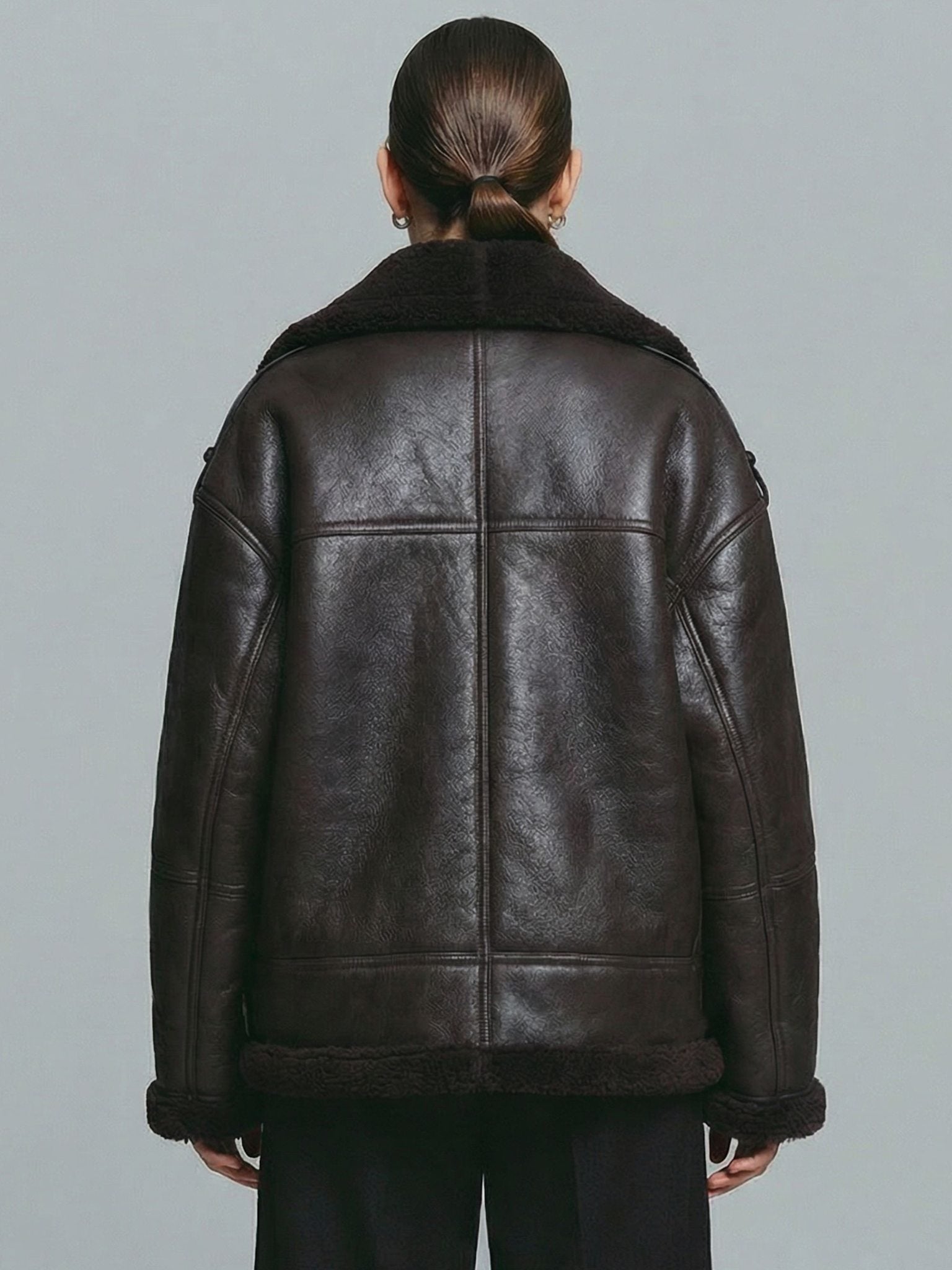 The Zoe Lambskin Shearling Jacket is crafted from rich dark brown lambskin with luxe leather details. Featuring shearling trim and a cozy shearling lining, it is finished with an off-centre button fastening. Designed with an oversized fit and dropped shoulders, this jacket blends relaxed comfort with standout style.