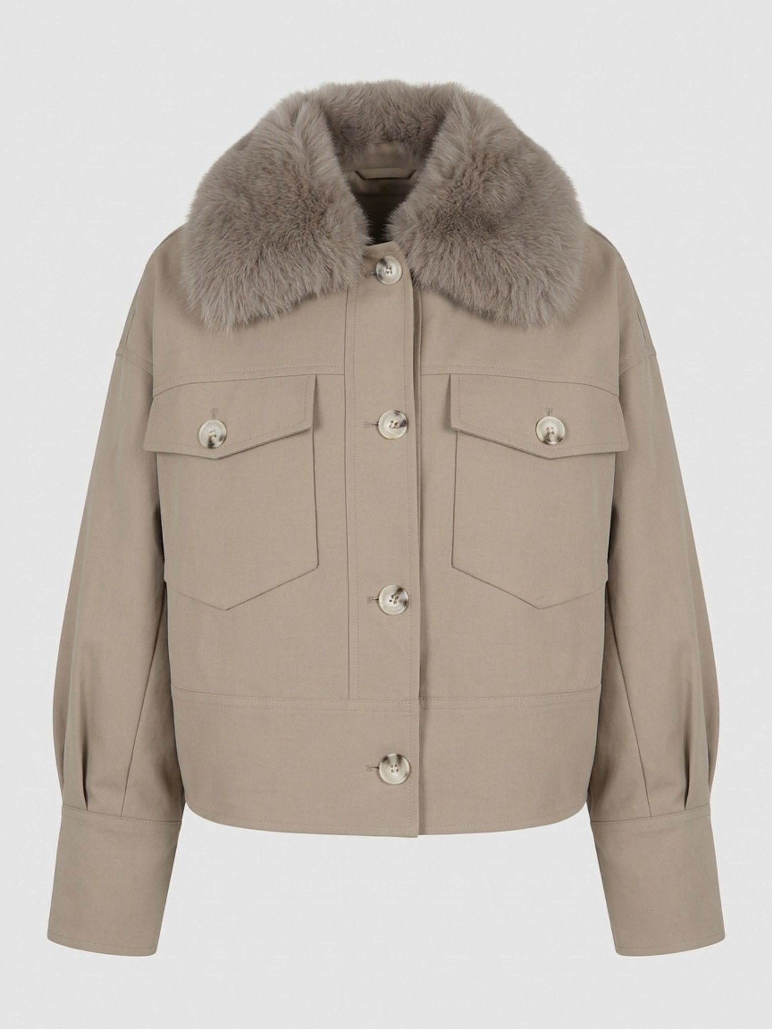 • Stylish beige jacket with a plush fur collar, featuring large front pockets and button closure, perfect for a chic look by MEOTINE.