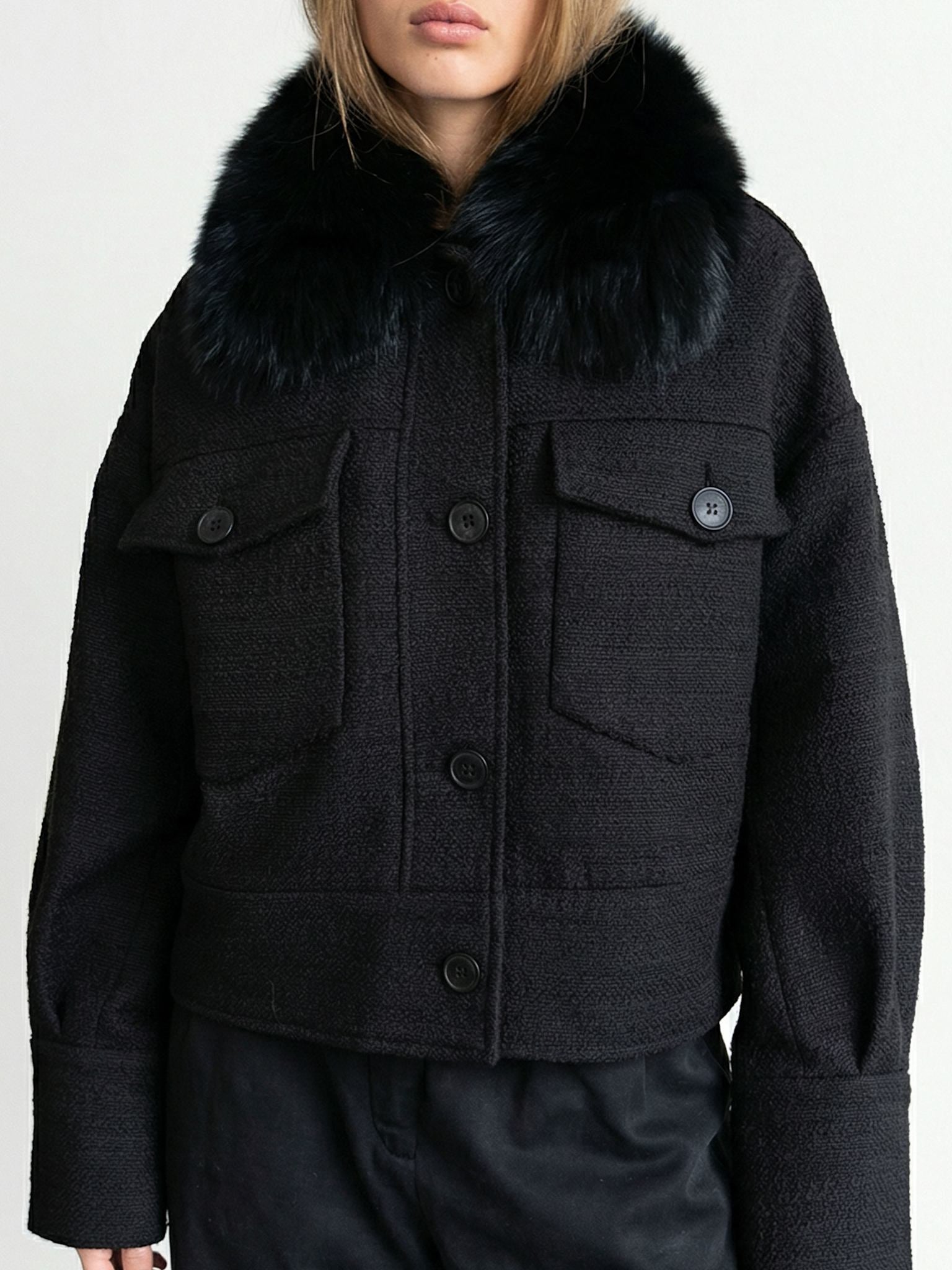 The classic Charlie jacket is a utility-inspired jacked in black colored in tweed for the upcoming summer season. It is designed with a detachable blue fox fur collar, two front pockets and button closure.